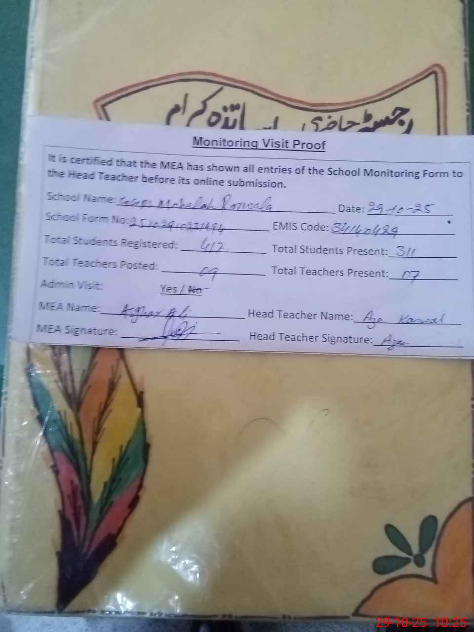 | Attendance Register | Head Teacher | MEA with School | Visit Proof |