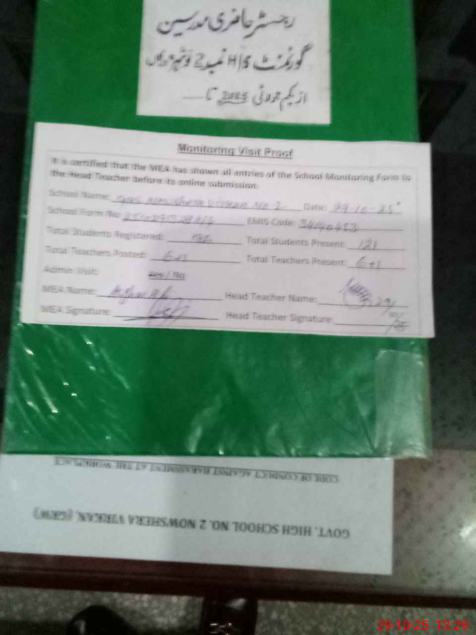 | Attendance Register | Head Teacher | MEA with School | Visit Proof |