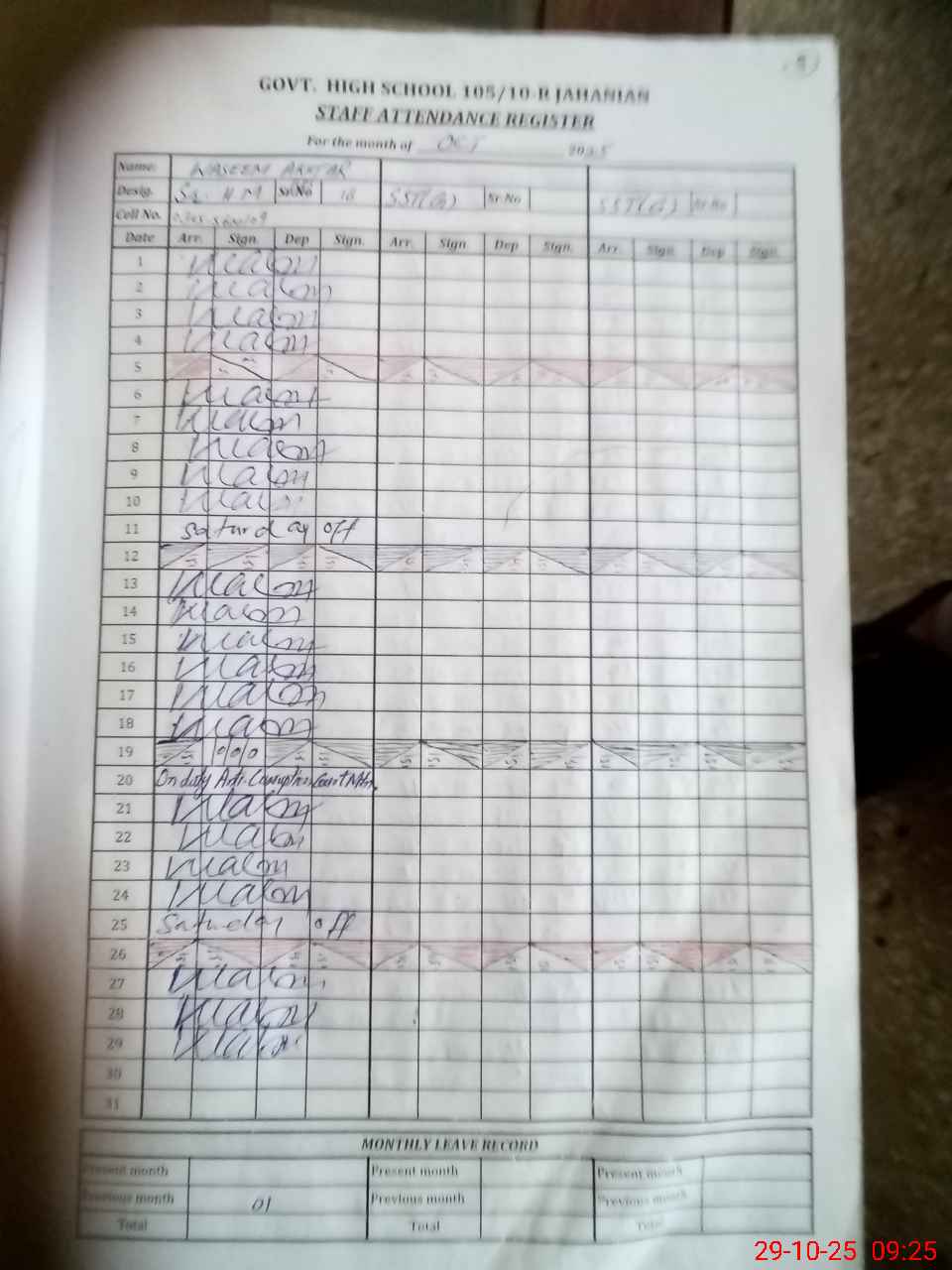 | CNIC | Full Name | Designation | R/C | Absence During Last Calender Month |
