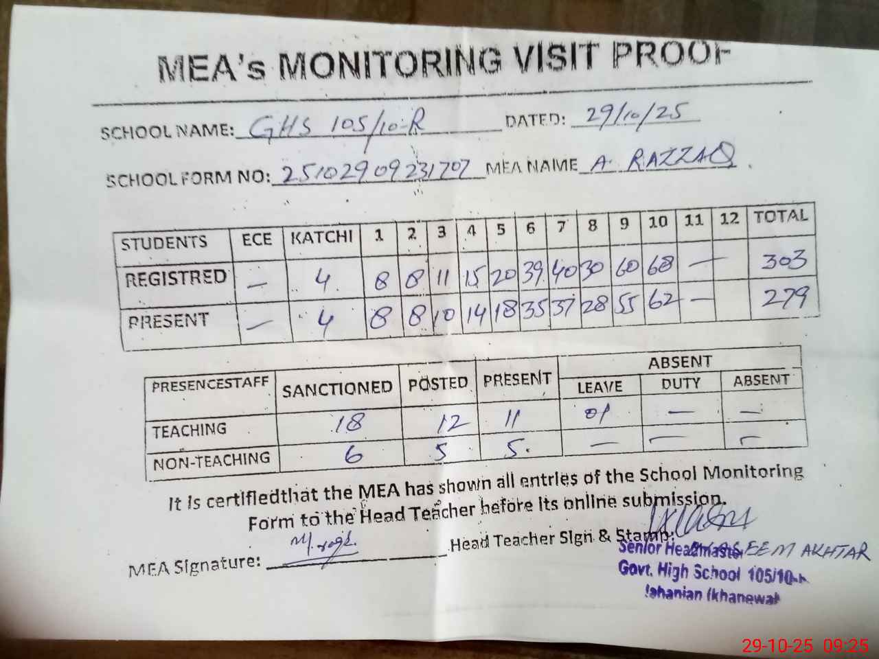 | Attendance Register | Head Teacher | MEA with School | Visit Proof |
