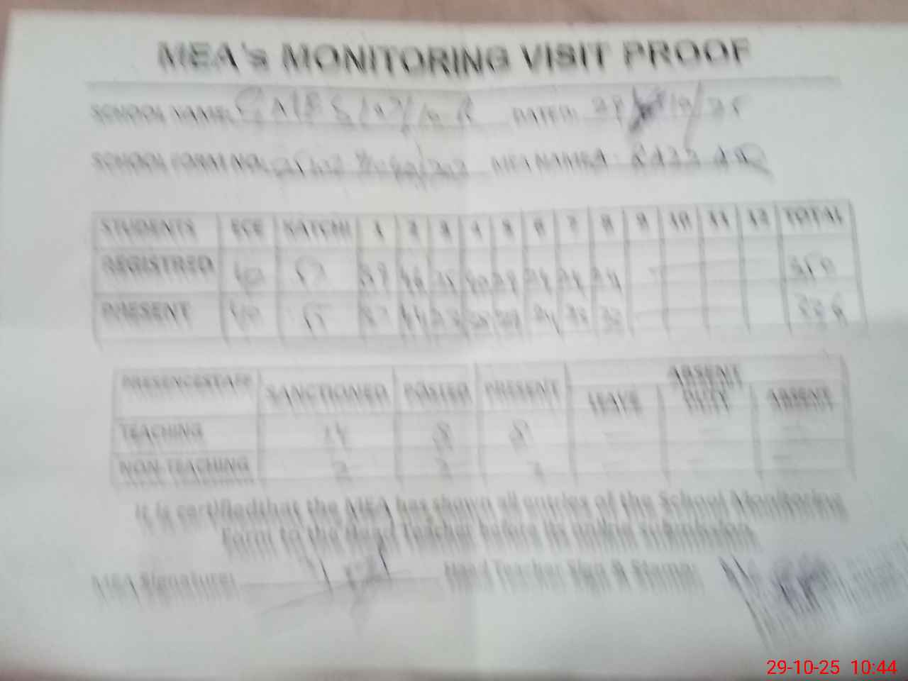 | Attendance Register | Head Teacher | MEA with School | Visit Proof |