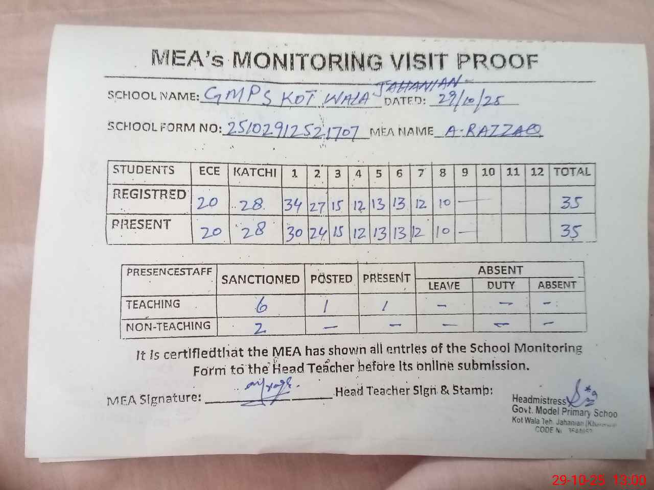 | Attendance Register | Head Teacher | MEA with School | Visit Proof |