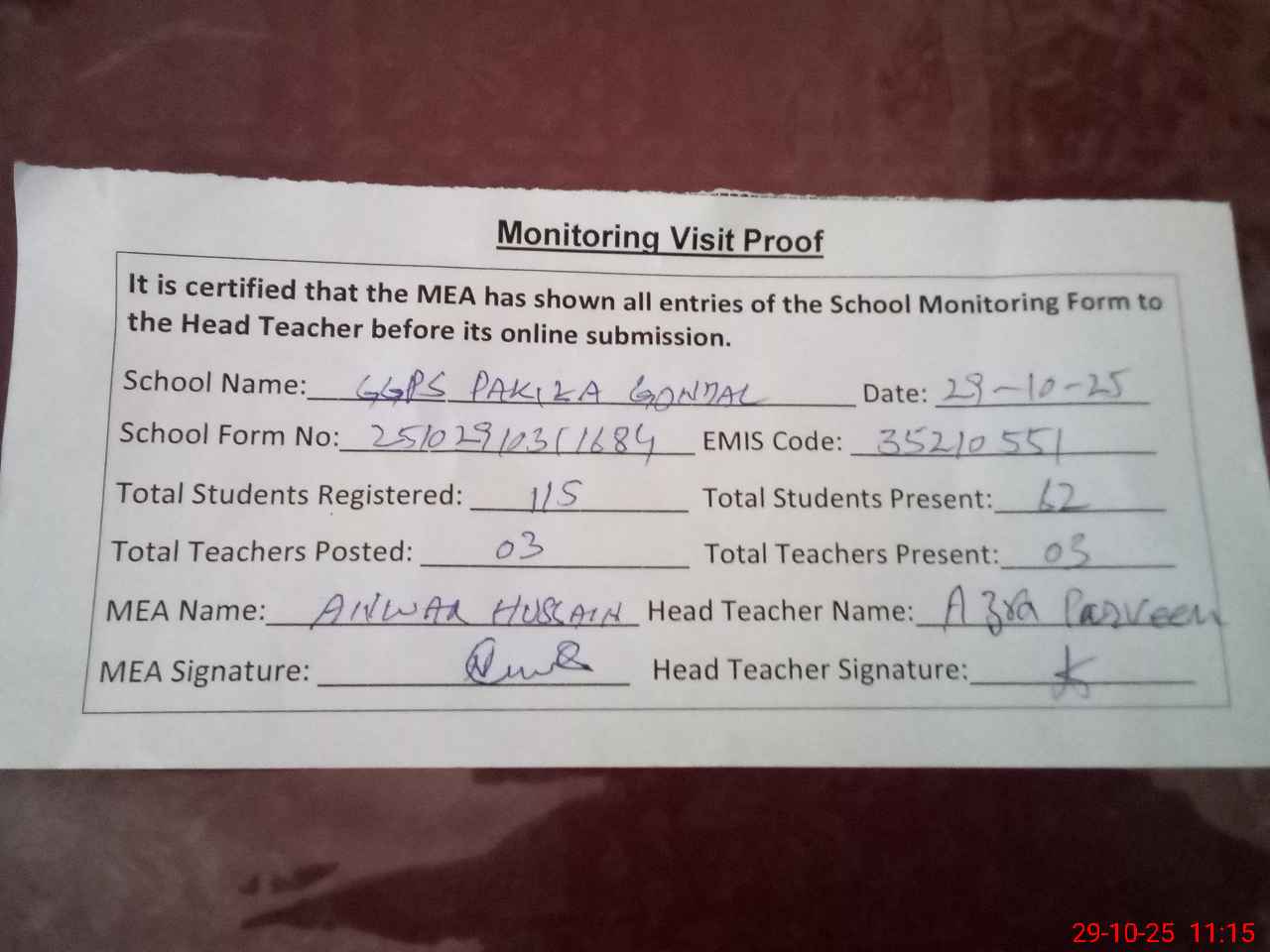 | Attendance Register | Head Teacher | MEA with School | Visit Proof |