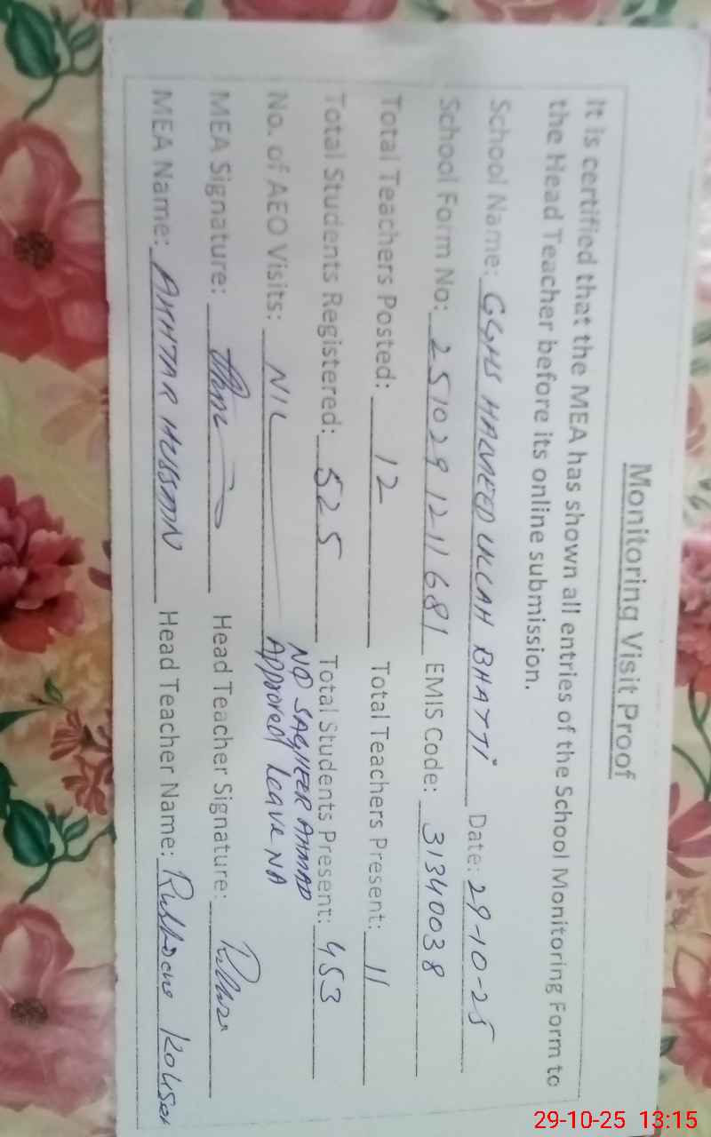 | Certified that this School was Inspected by the Undersigned MEA/DMO Today and the Information Stated Above is as Per Record. | |||||
