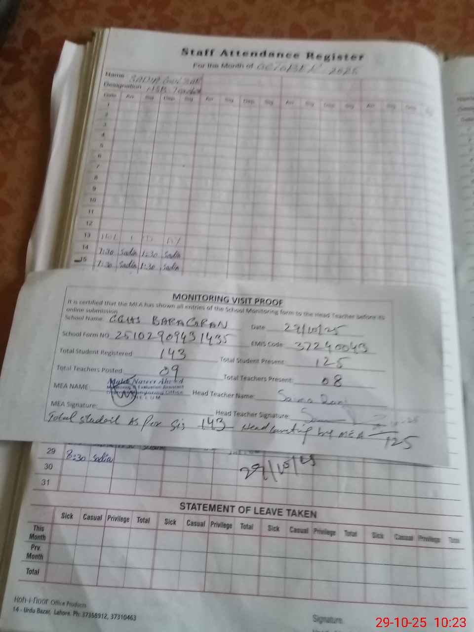 | Attendance Register | Head Teacher | MEA with School | Visit Proof |