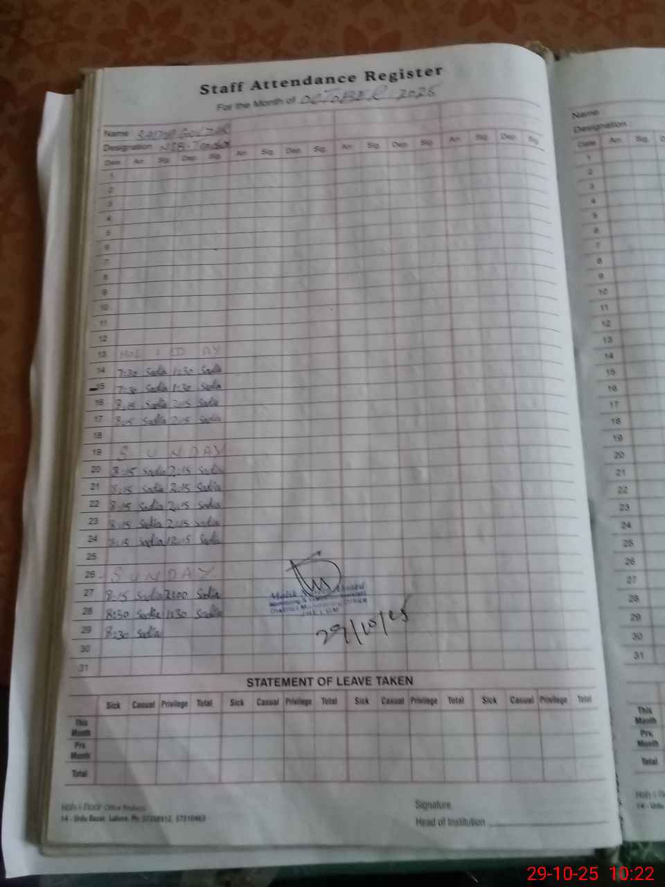 | Name: SA**** RA**** Designation: (School Headmaster's/Headmistress's) S.S.T.(GEN) Phone/Cell Number: 03**** |