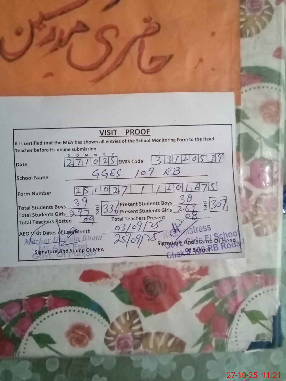 | Attendance Register | Head Teacher | MEA with School | Visit Proof |