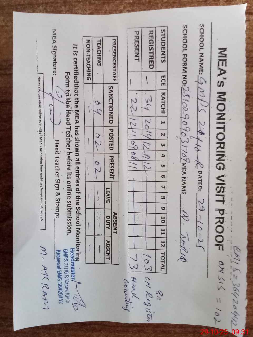 | Attendance Register | Head Teacher | MEA with School | Visit Proof |