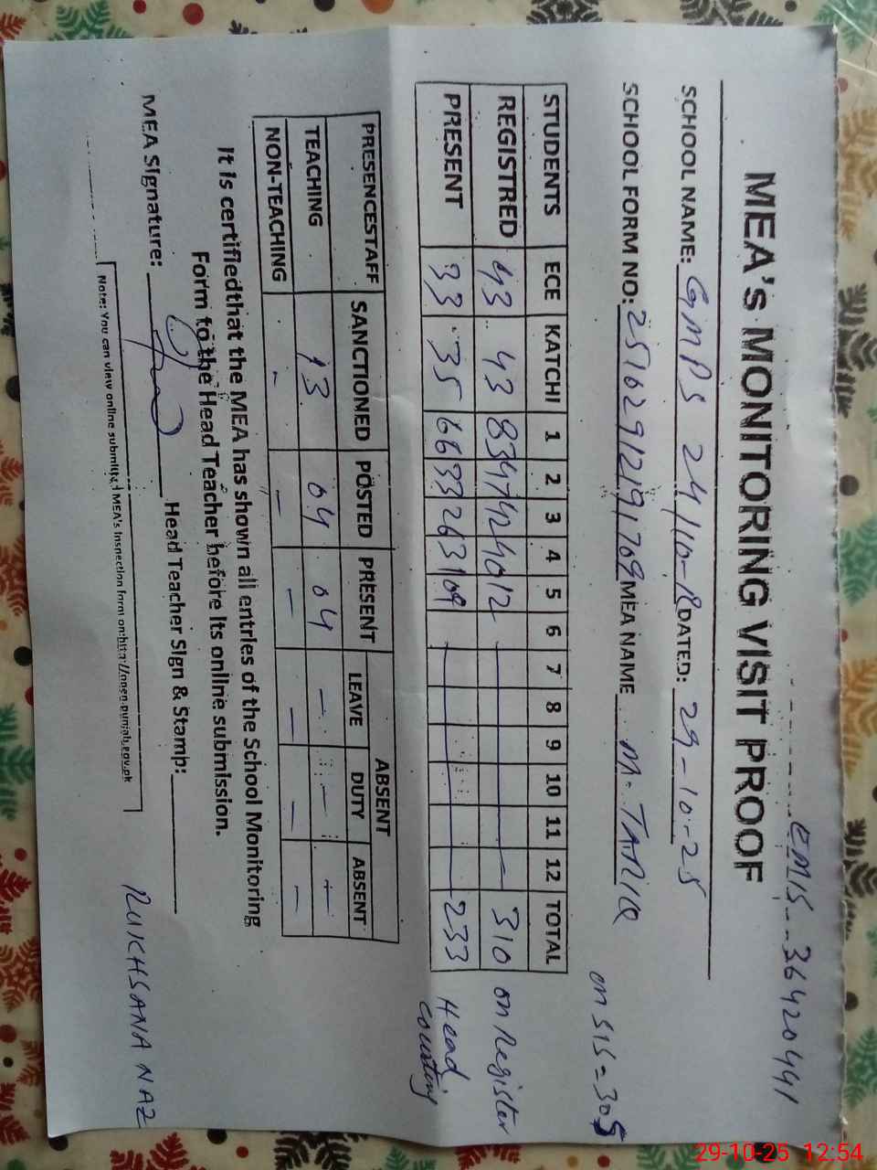 | Certified that this School was Inspected by the Undersigned MEA/DMO Today and the Information Stated Above is as Per Record. | |||||