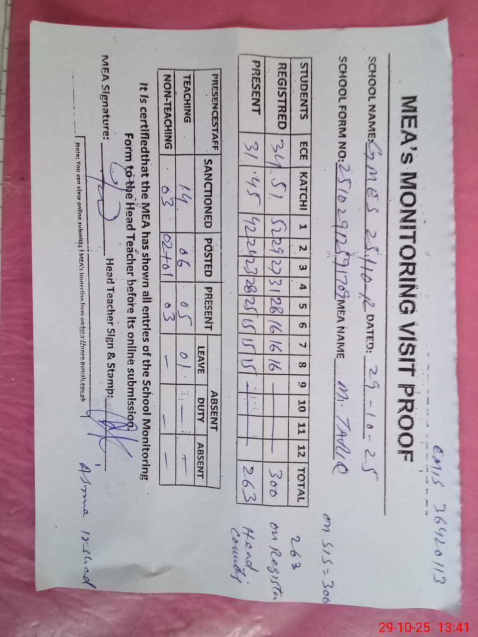 | Attendance Register | Head Teacher | MEA with School | Visit Proof |