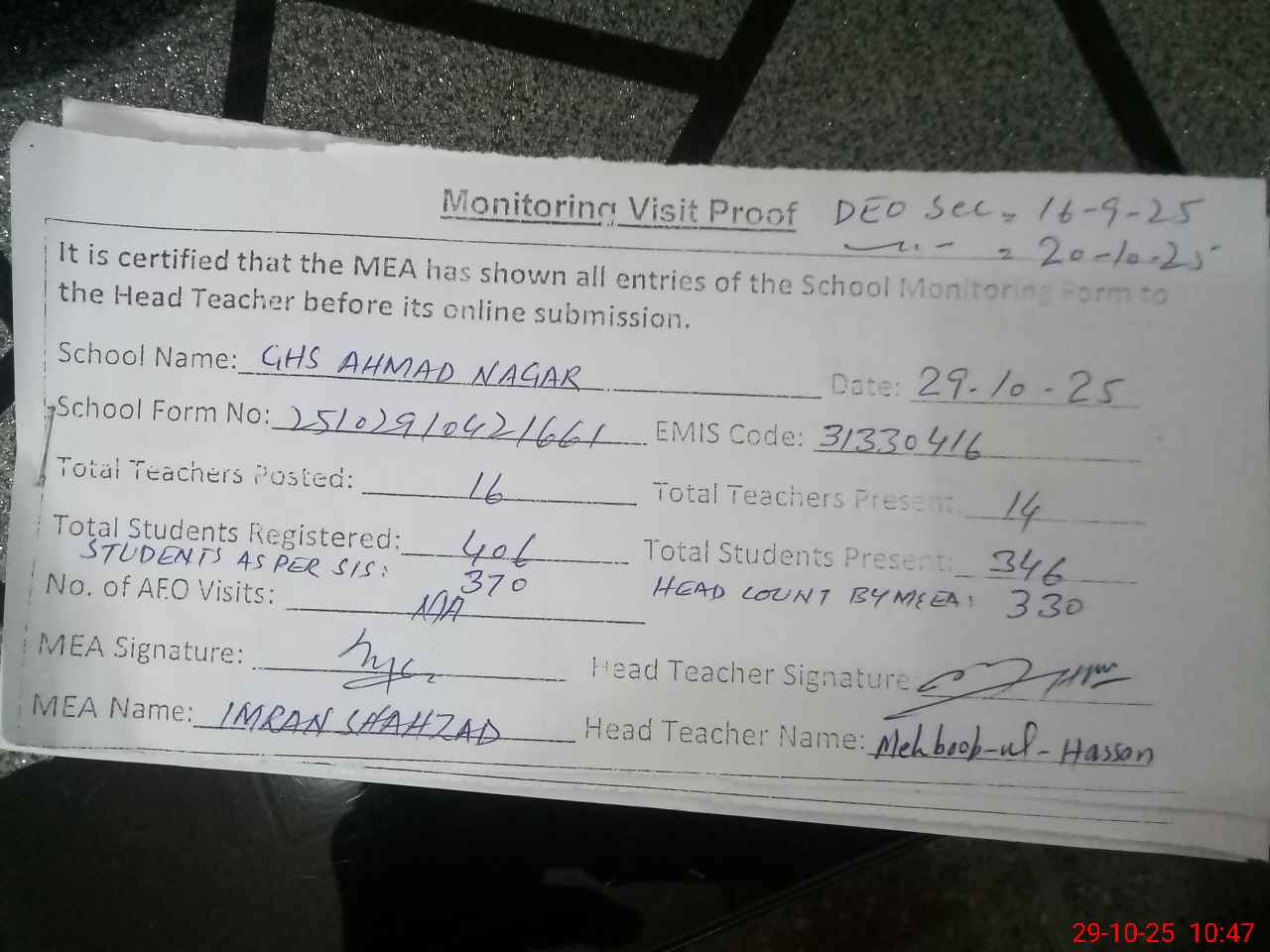 | Certified that this School was Inspected by the Undersigned MEA/DMO Today and the Information Stated Above is as Per Record. | |||||