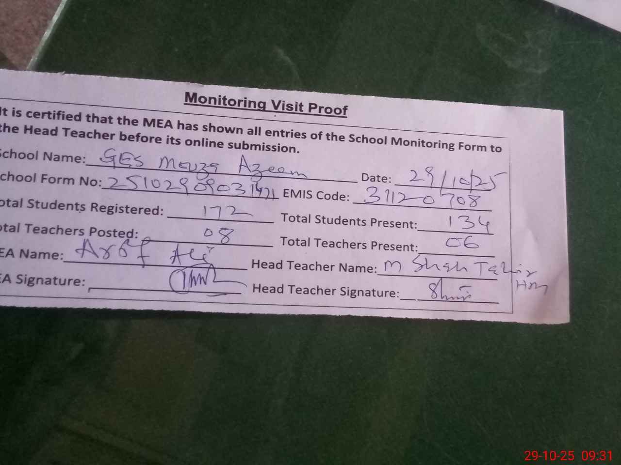 | Attendance Register | Head Teacher | MEA with School | Visit Proof |