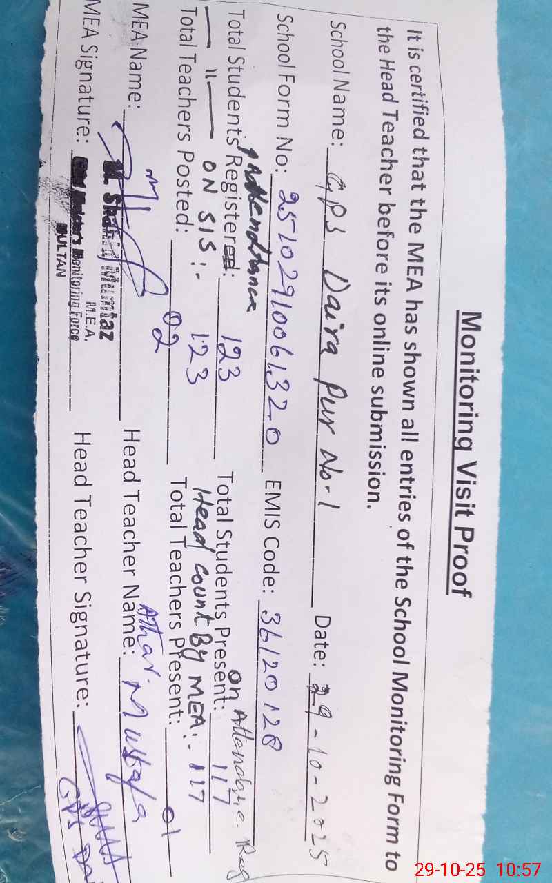 | EMIS Code: 36120128 | Name of School: GPS DAIRA PUR 1 P/O SIKANDARABAD SHUJABAD | |||