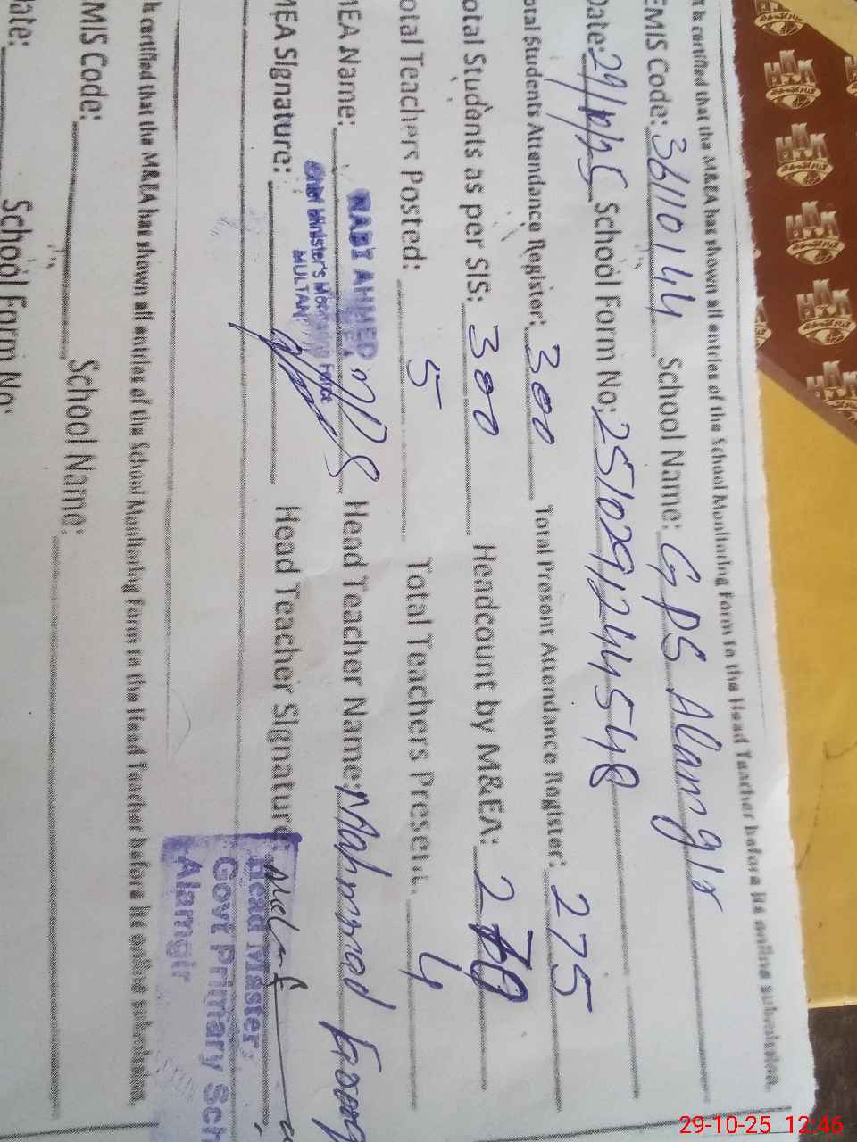 | EMIS Code: 36110144 | Name of School: GPS ALAM GIR MOUZA ALAMGIR TEH. DISTT. MULTAN | |||