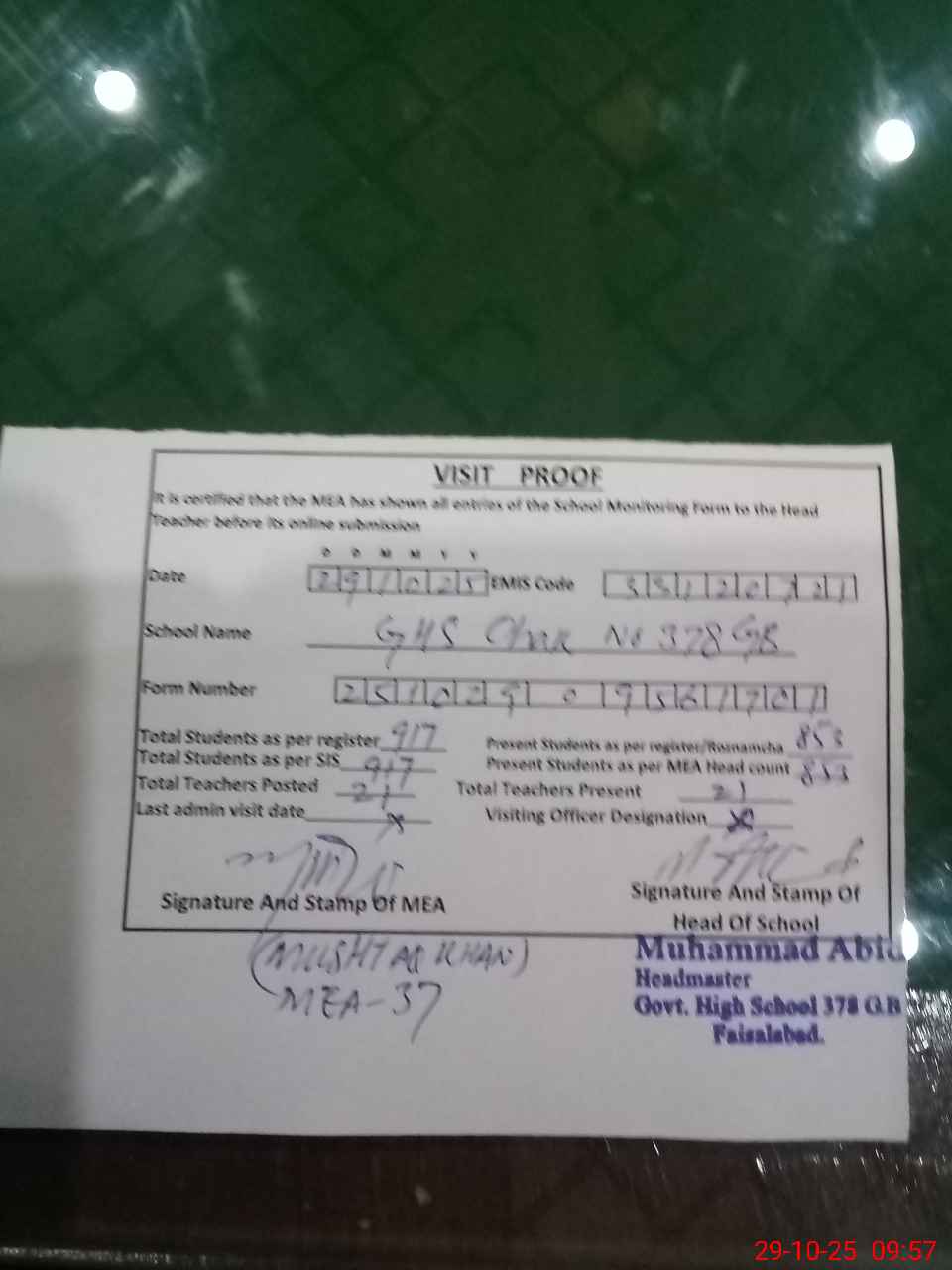 | EMIS Code: 33120721 | Name of School: GHS CHAK NO 378 GB | |||