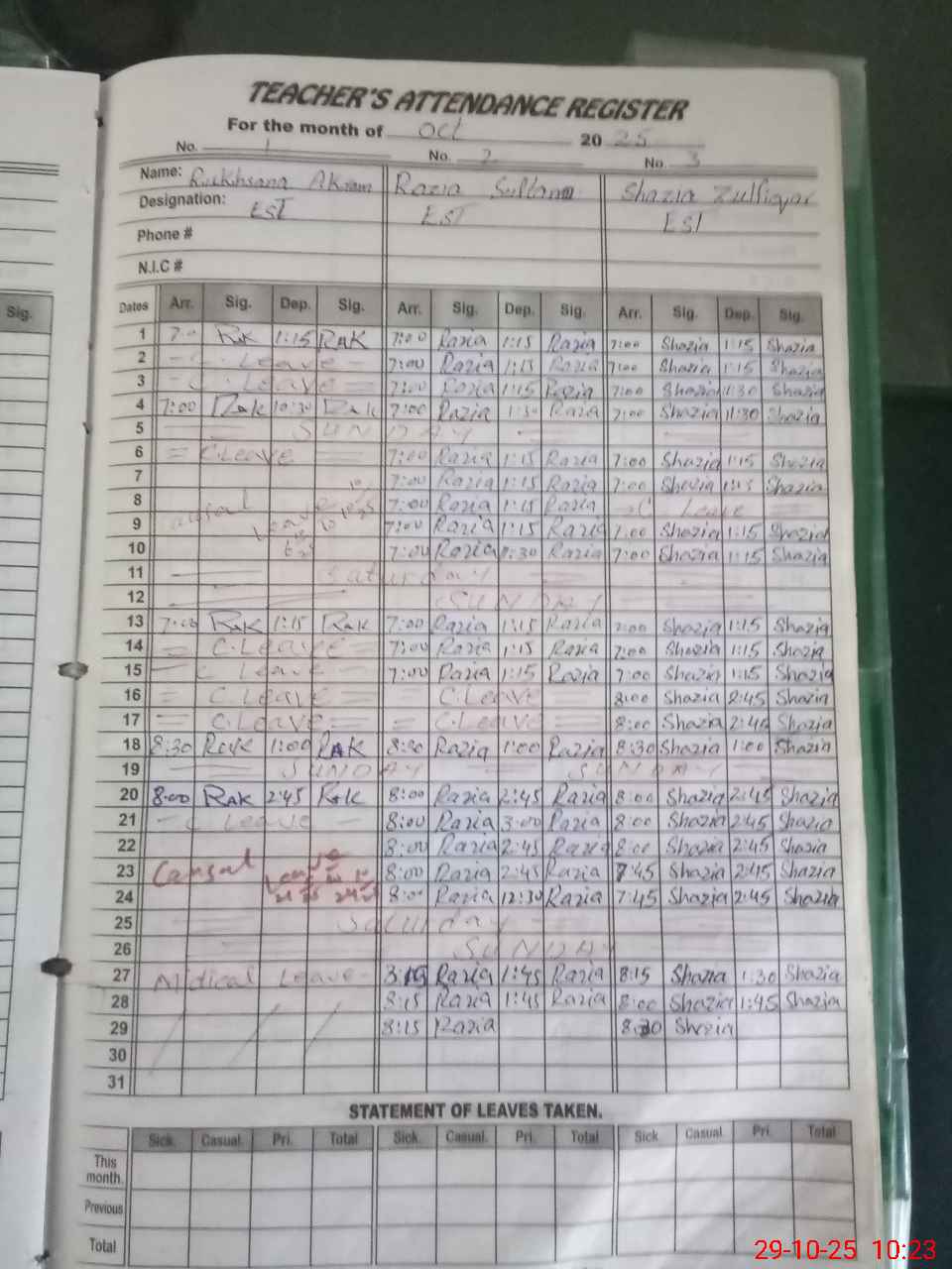 | CNIC | Full Name | Designation | R/C | Absence During Last Calender Month |