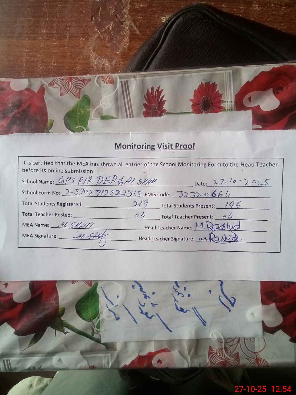 | Attendance Register | Head Teacher | MEA with School | Visit Proof |