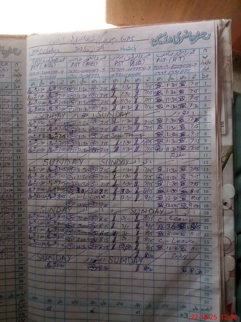| CNIC | Full Name | Designation | R/C | Absence During Last Calender Month |