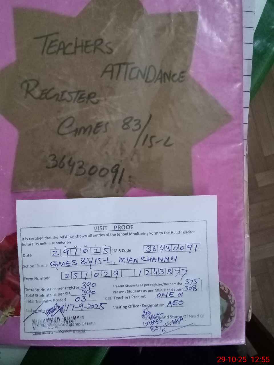 | Certified that this School was Inspected by the Undersigned MEA/DMO Today and the Information Stated Above is as Per Record. | |||||