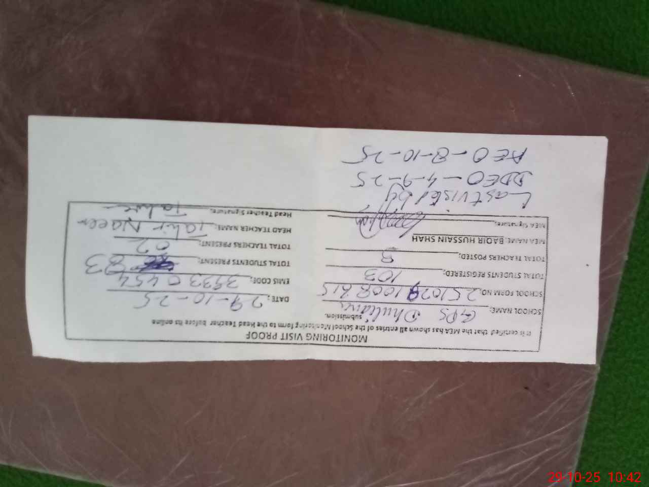 | Attendance Register | Head Teacher | MEA with School | Visit Proof |