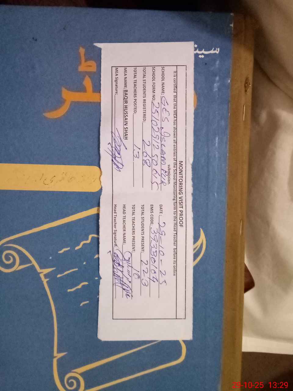 | Remarks (Use Separate Page if Required): Last admin byDEO EE at 22 oct 2025 Last visit by AEO 28TH October | |||||