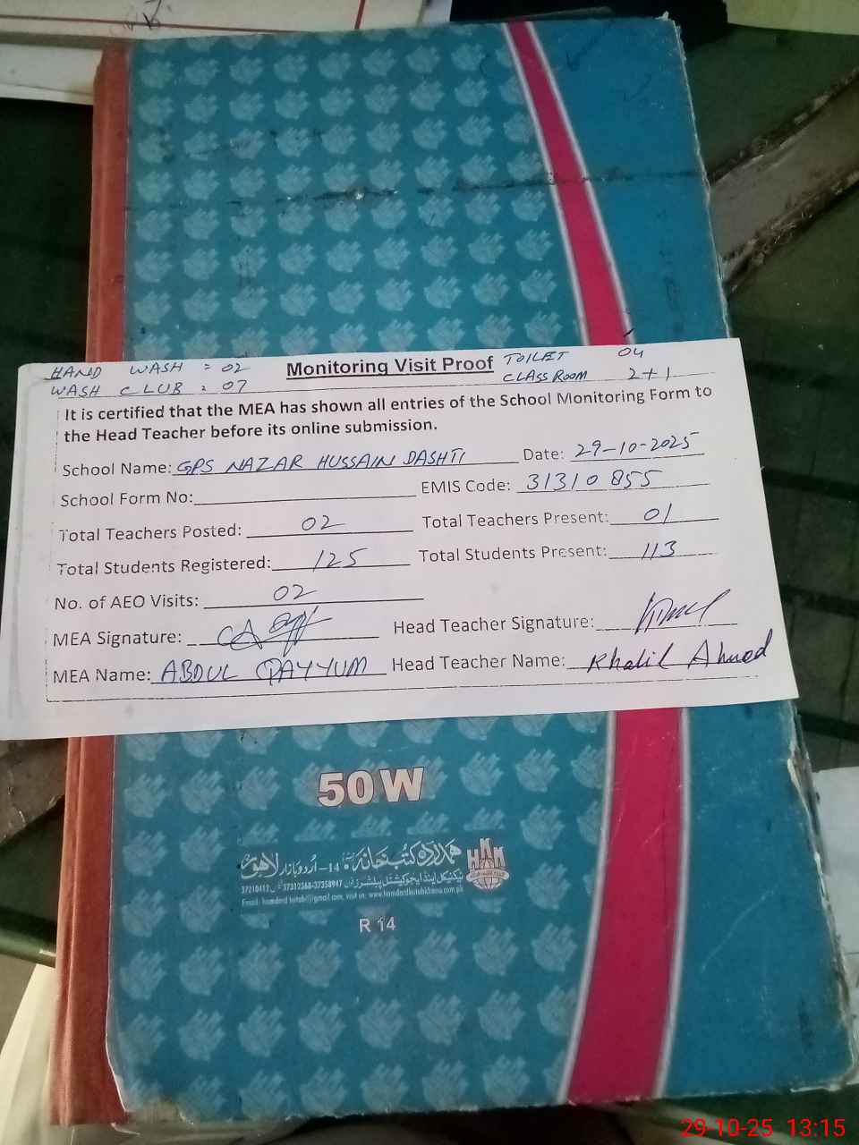 | EMIS Code: 31310855 | Name of School: GPS NAZAR HUSSAIN DASHTI (After Noon) | |||