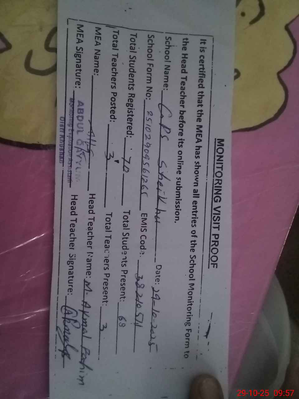| Attendance Register | Head Teacher | MEA with School | Visit Proof |