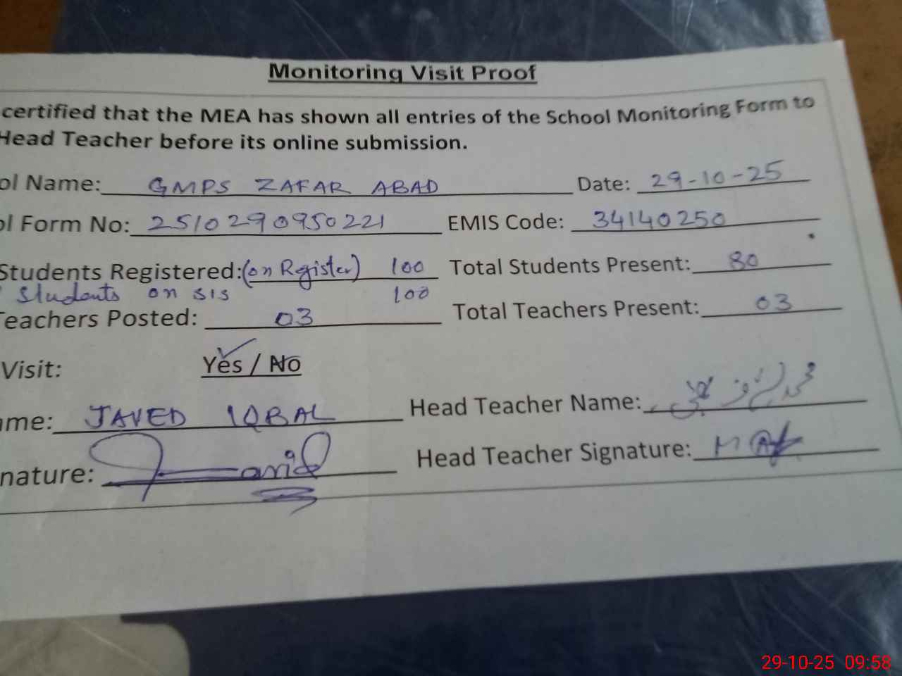 | Attendance Register | Head Teacher | MEA with School | Visit Proof |