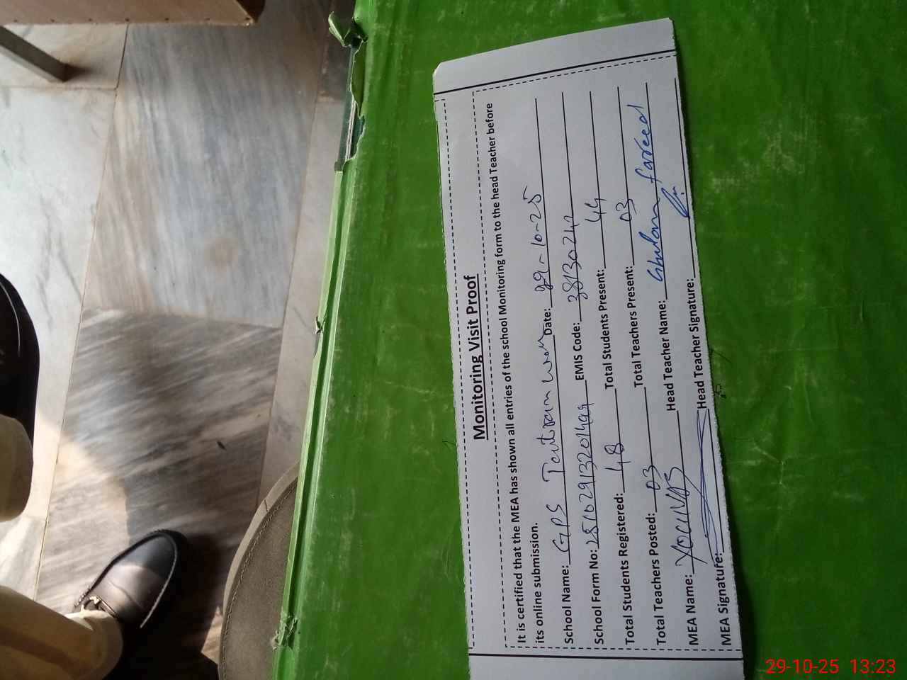| Attendance Register | Head Teacher | MEA with School | Visit Proof |