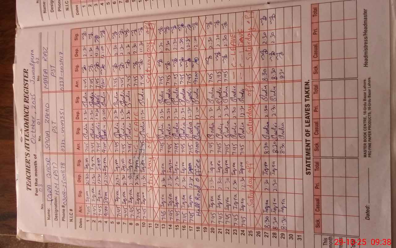 | Name: Iq**** Qa**** Designation: (School Headmaster's/Headmistress's) Head Mistress Phone/Cell Number: 03**** |
