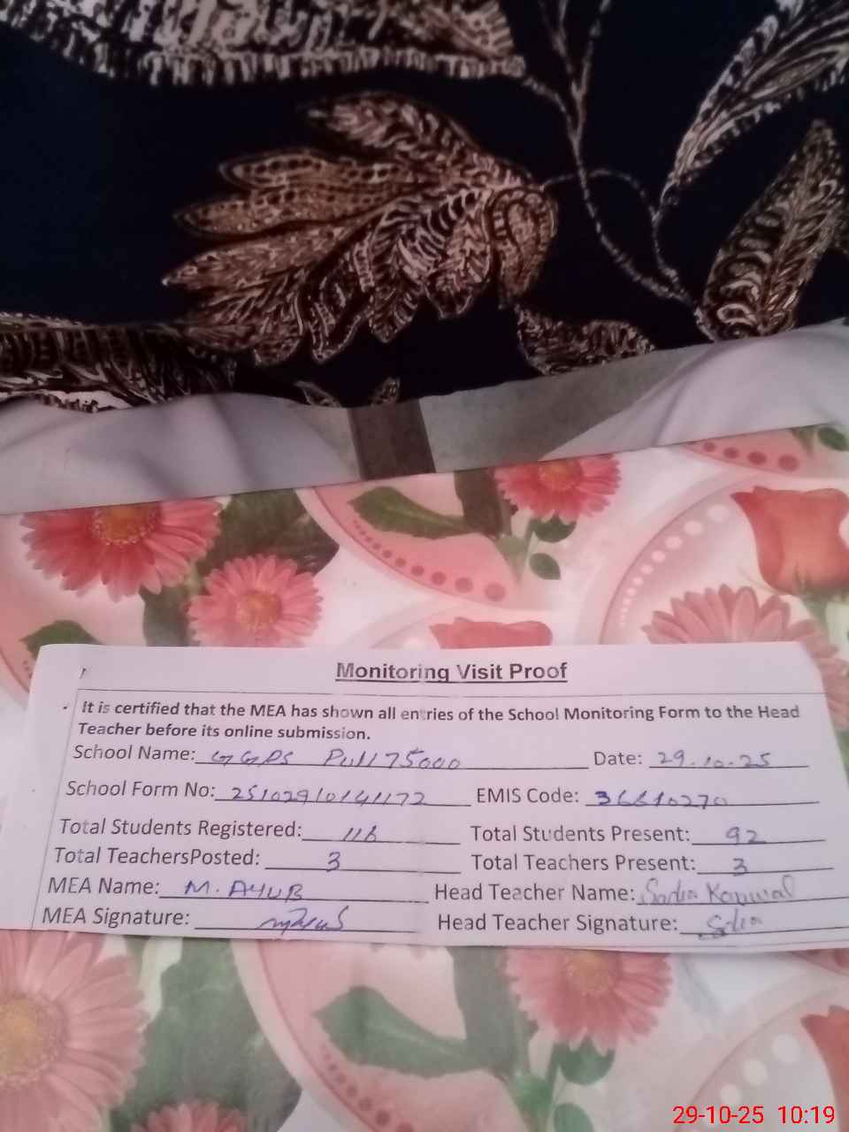 | Certified that this School was Inspected by the Undersigned MEA/DMO Today and the Information Stated Above is as Per Record. | |||||