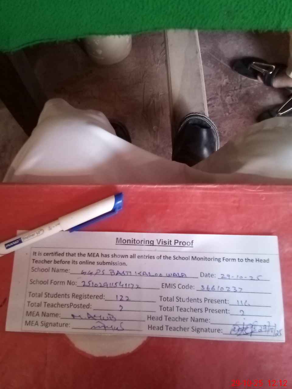 | Attendance Register | Head Teacher | MEA with School | Visit Proof |