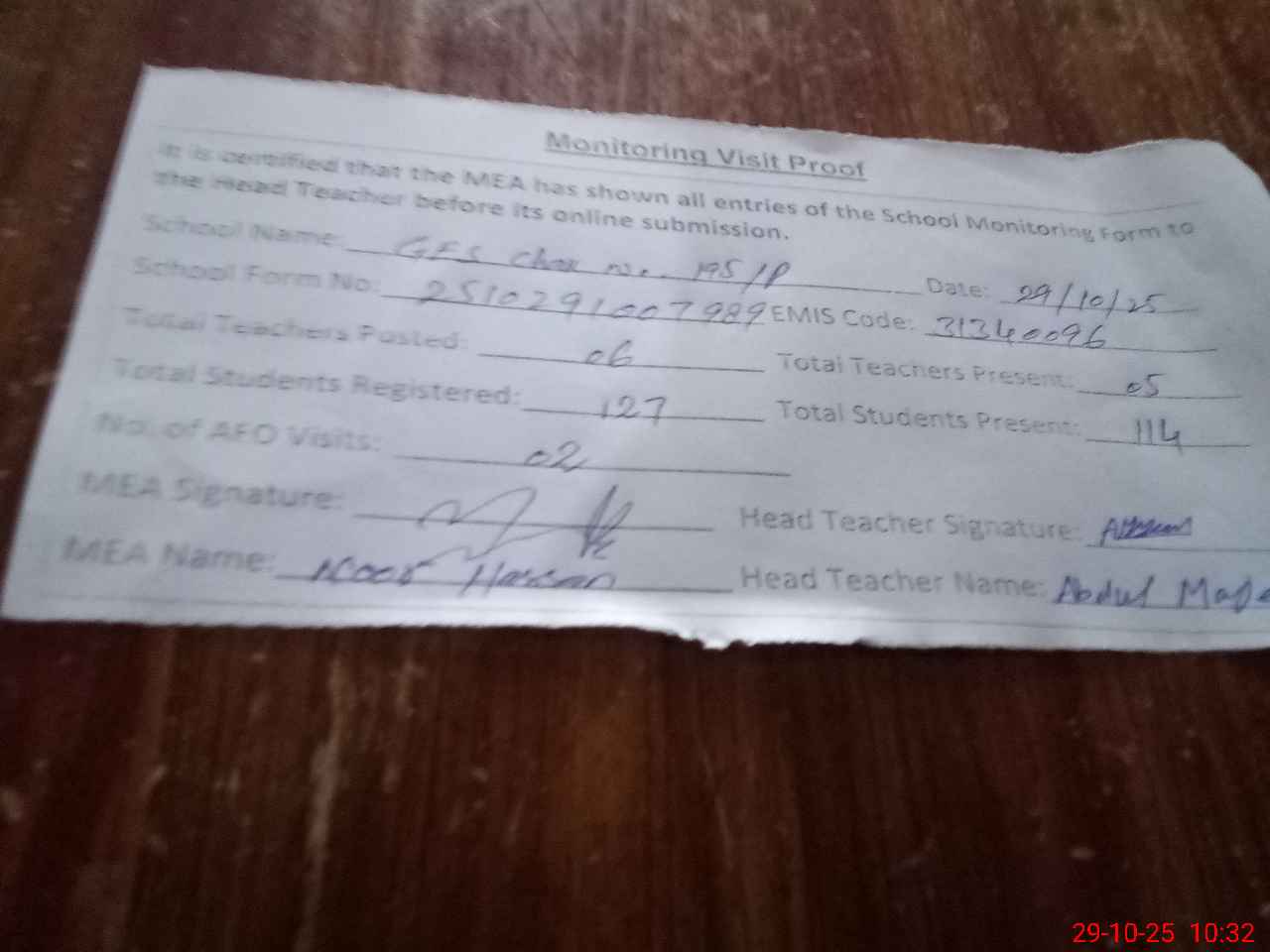 | Attendance Register | Head Teacher | MEA with School | Visit Proof |
