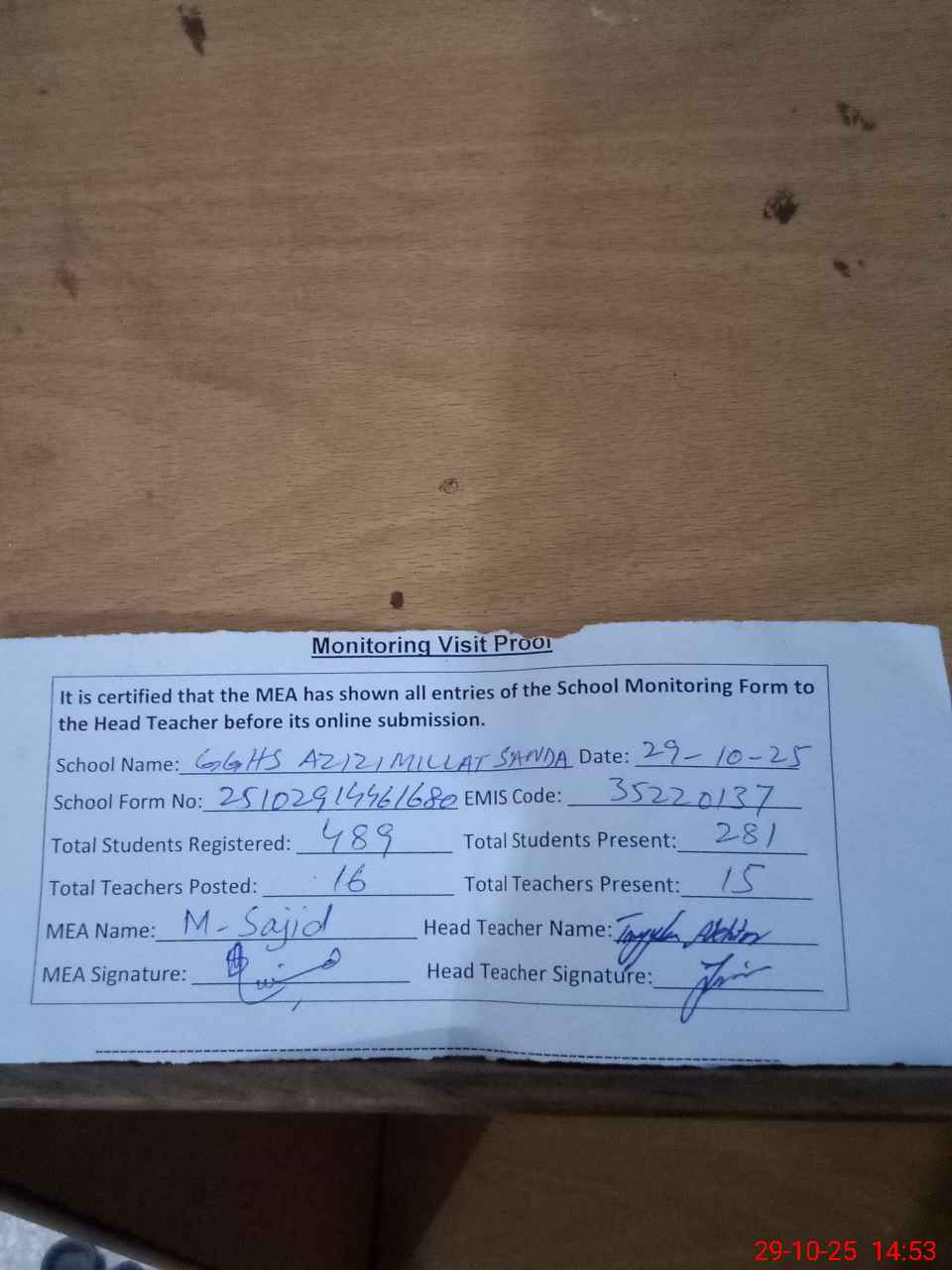 | Attendance Register | Head Teacher | MEA with School | Visit Proof |
