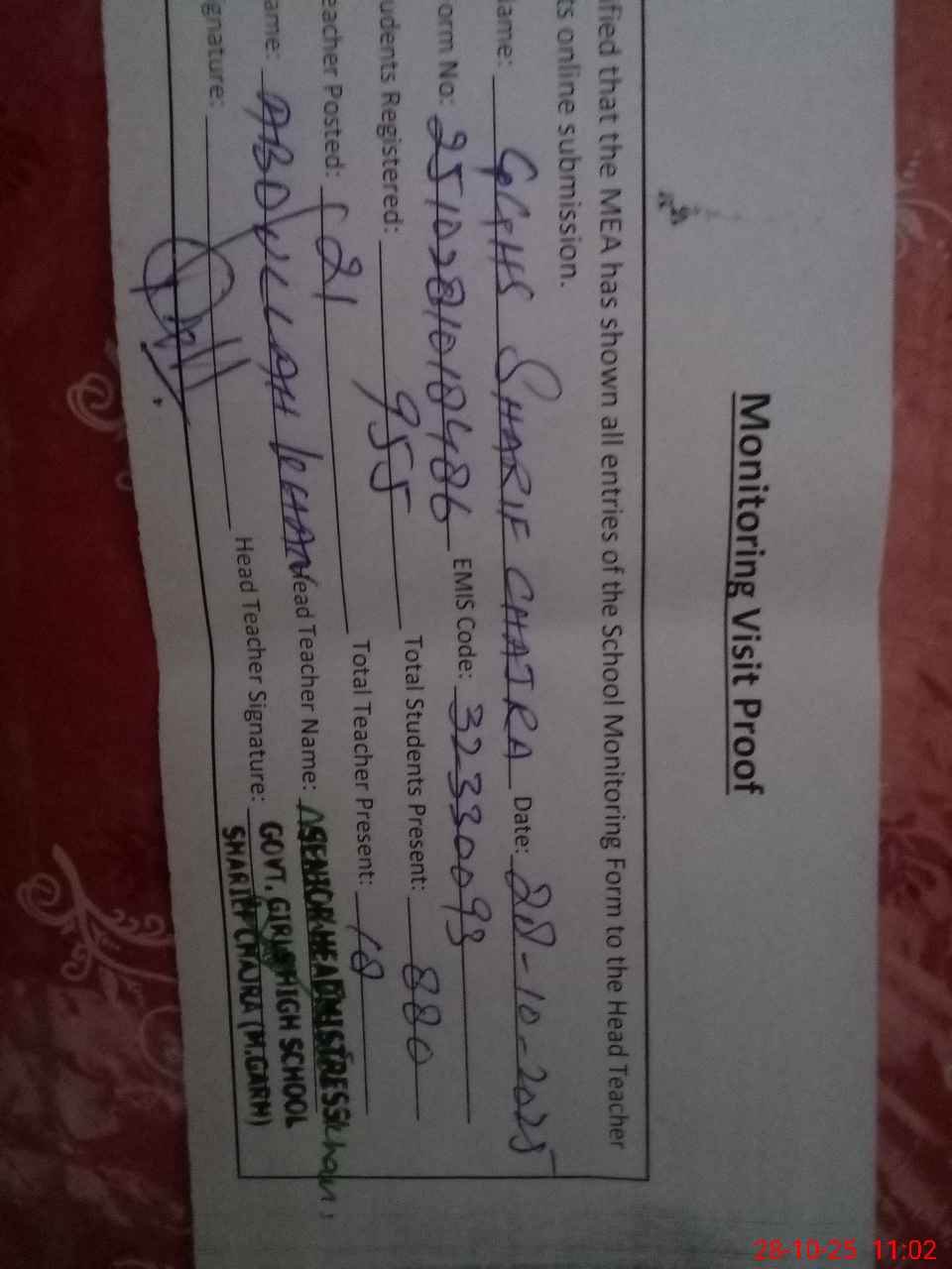 | Attendance Register | Head Teacher | MEA with School | Visit Proof |