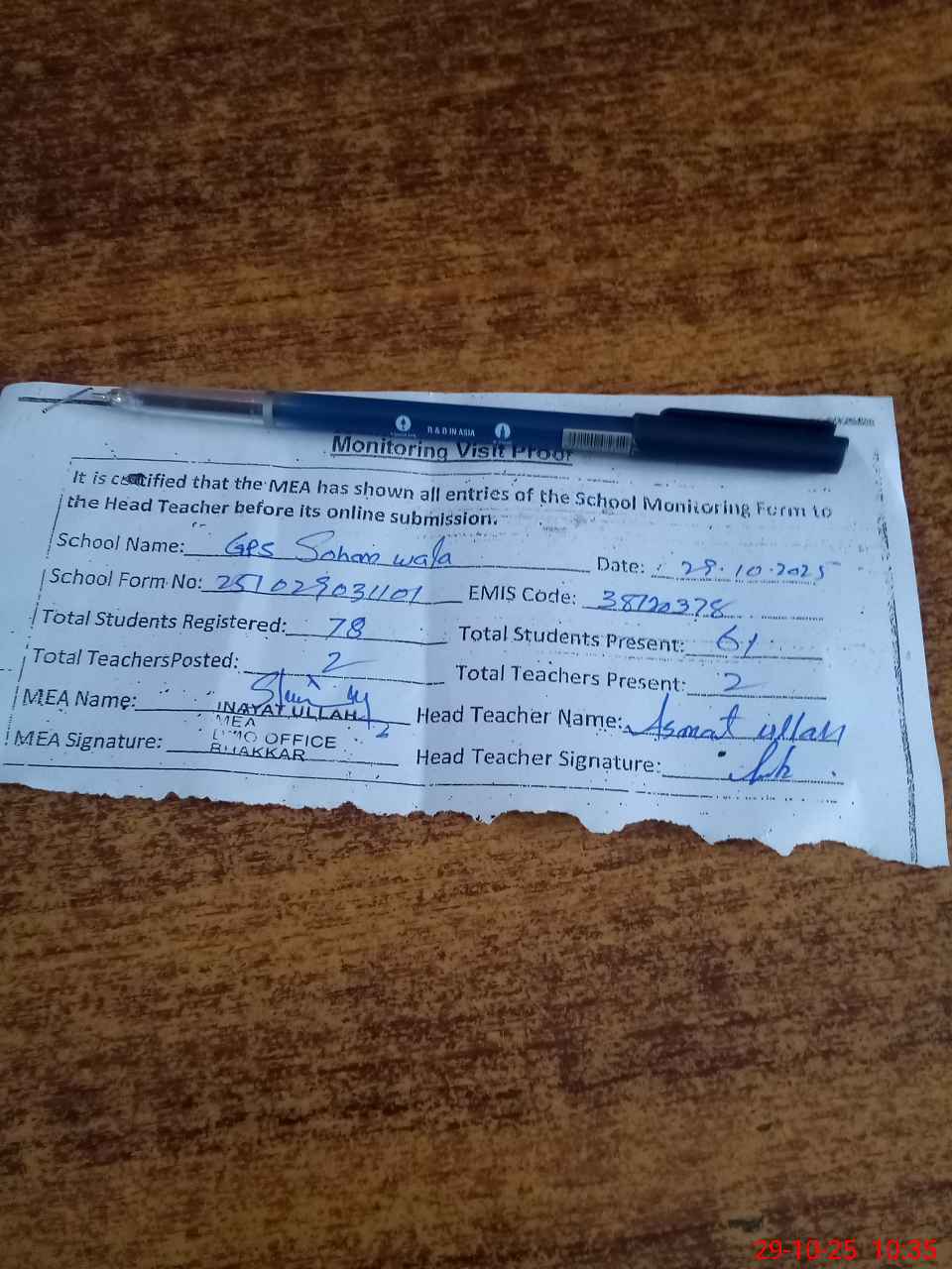 | Attendance Register | Head Teacher | MEA with School | Visit Proof |