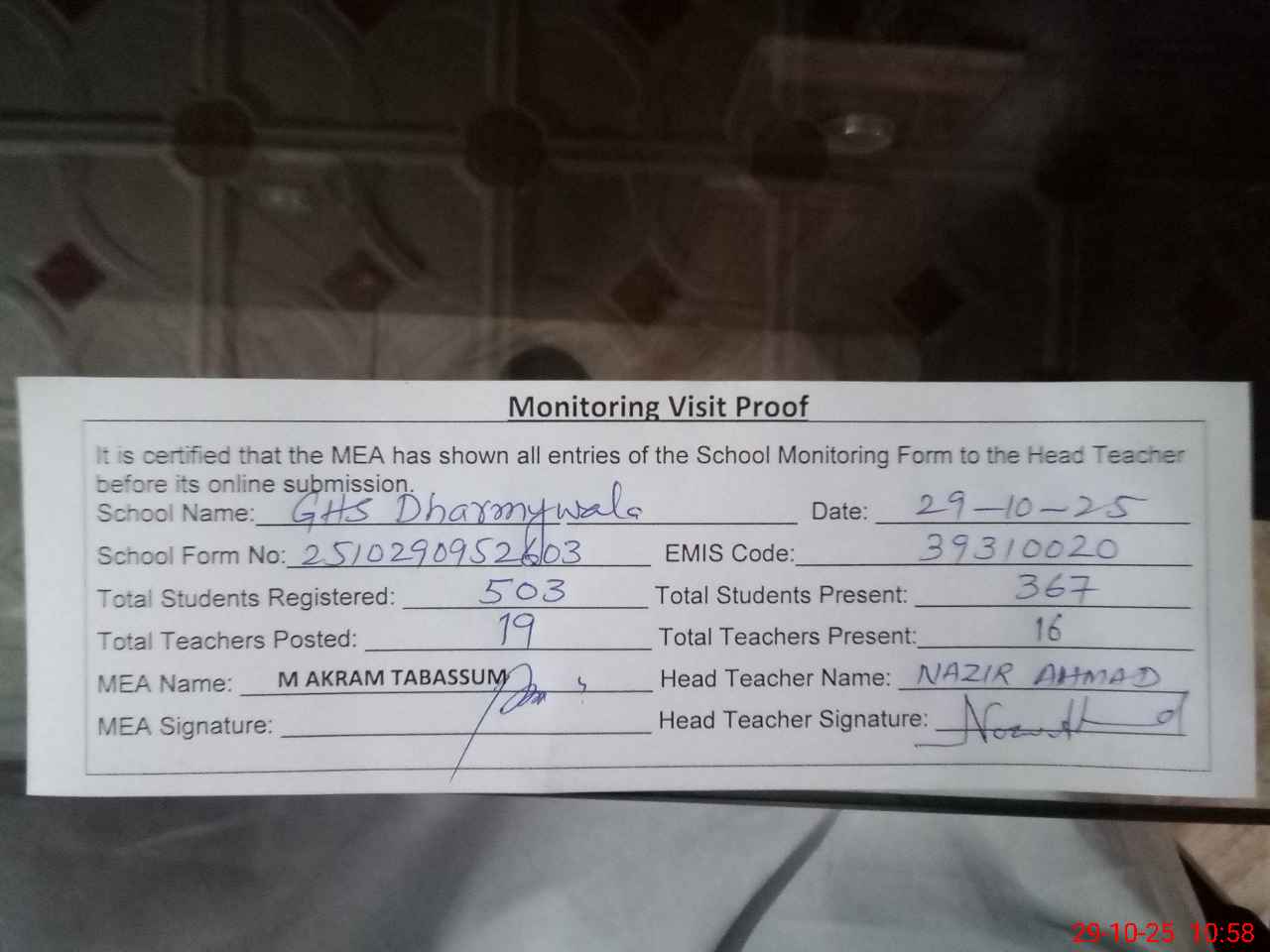 | Attendance Register | Head Teacher | MEA with School | Visit Proof |
