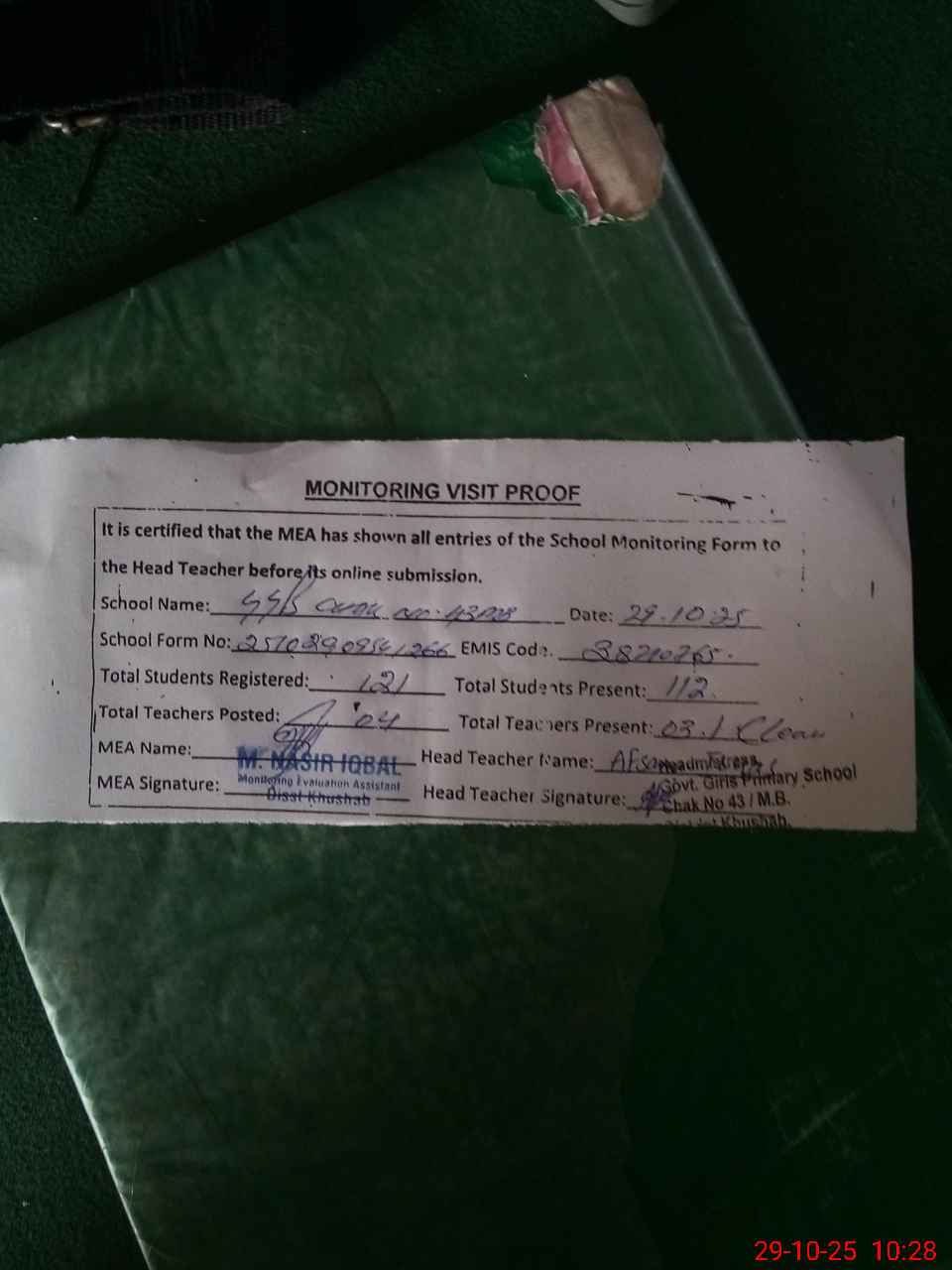| EMIS Code: 38210765 | Name of School: GGPS CHAK NO 43 MB | |||