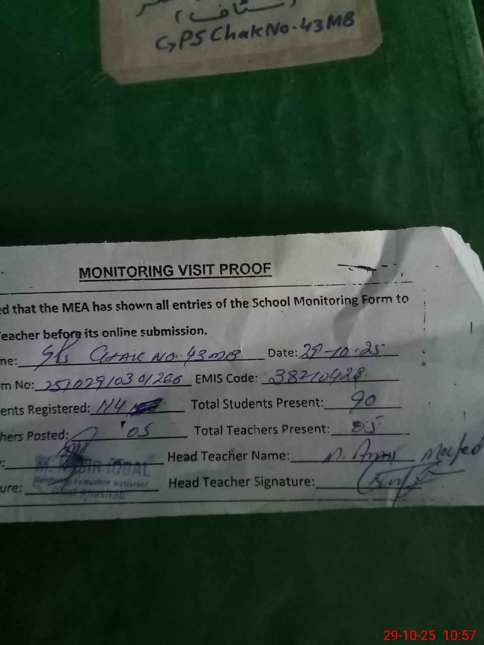 | EMIS Code: 38210428 | Name of School: GPS CHAK NO. 43 MB | |||
