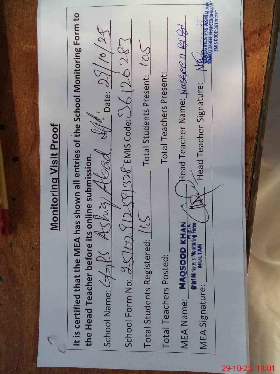 | EMIS Code: 36120283 | Name of School: GGPS ASHIQ ABAD SHUJABAD | |||