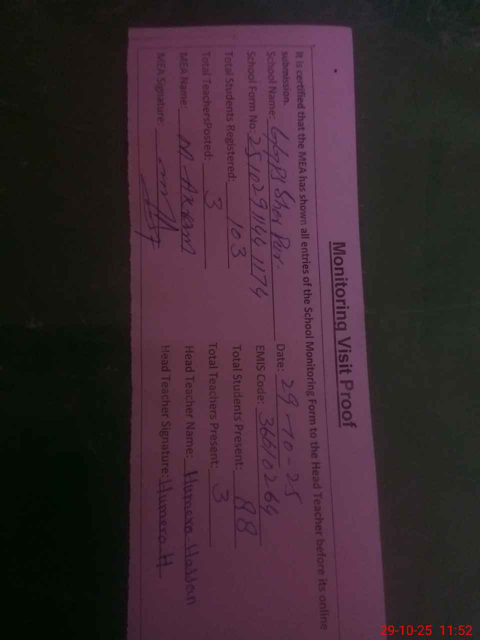 | Attendance Register | Head Teacher | MEA with School | Visit Proof |