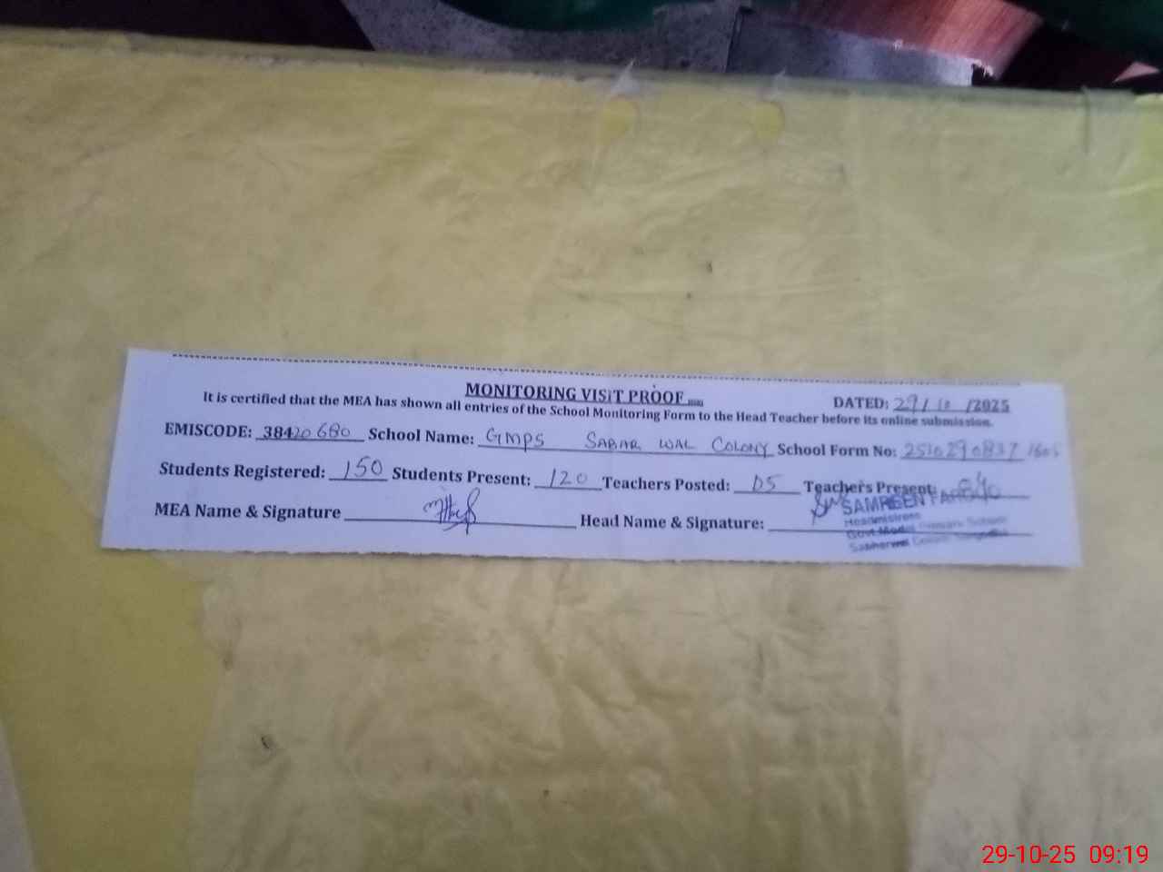 | Attendance Register | Head Teacher | MEA with School | Visit Proof |