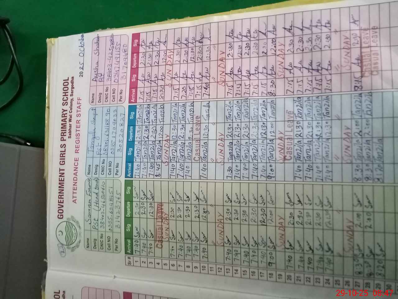 | CNIC | Full Name | Designation | R/C | Absence During Last Calender Month |