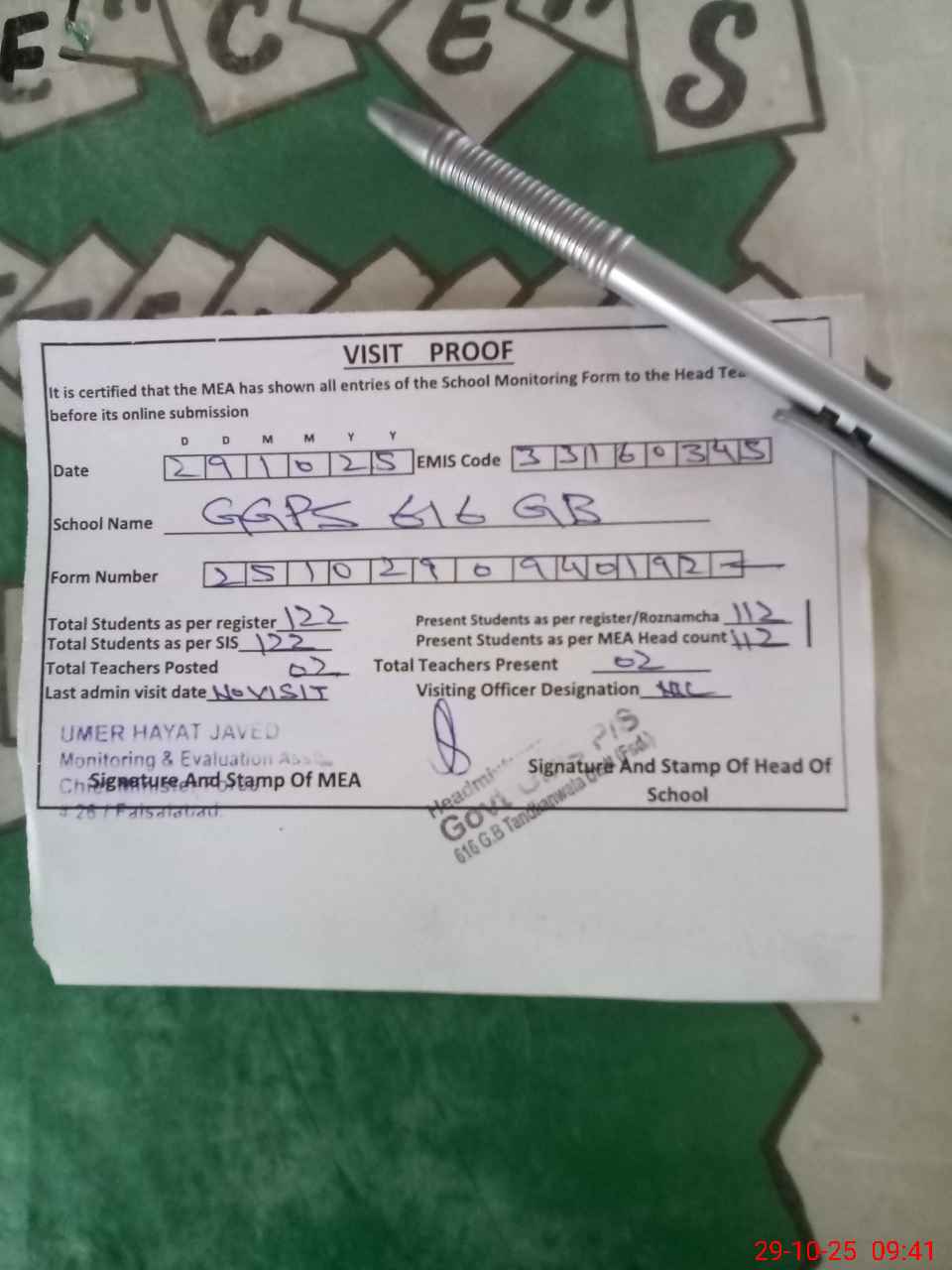| EMIS Code: 33160345 | Name of School: GGPS 616/GB | |||