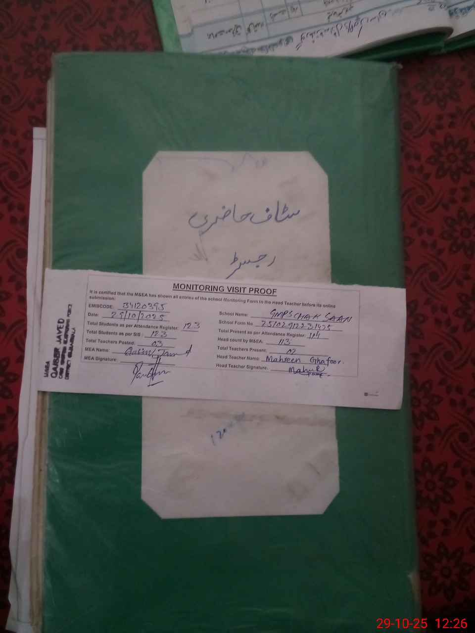| Attendance Register | Head Teacher | MEA with School | Visit Proof |