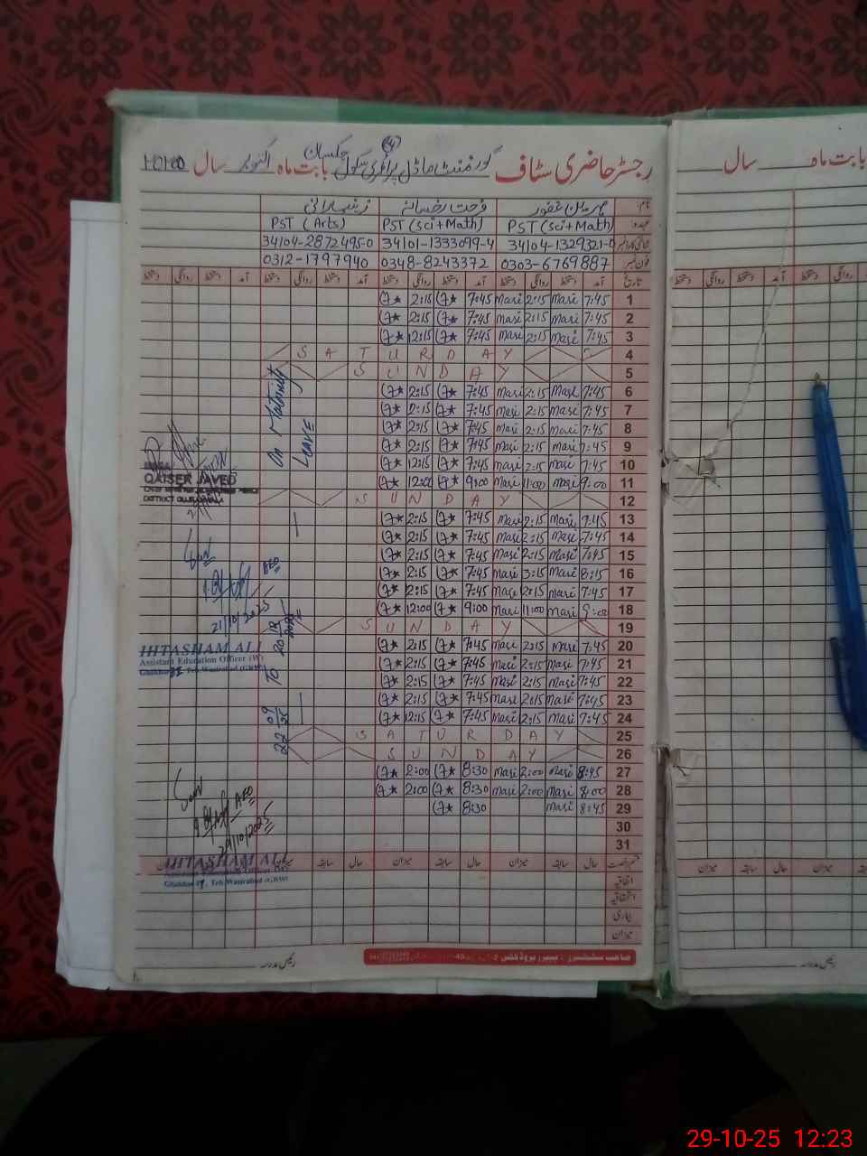 | Remarks (Use Separate Page if Required): Attendence not up date on sis more over Zenab Rani pst applied maternity leave and approval awaiting 0 | |||||