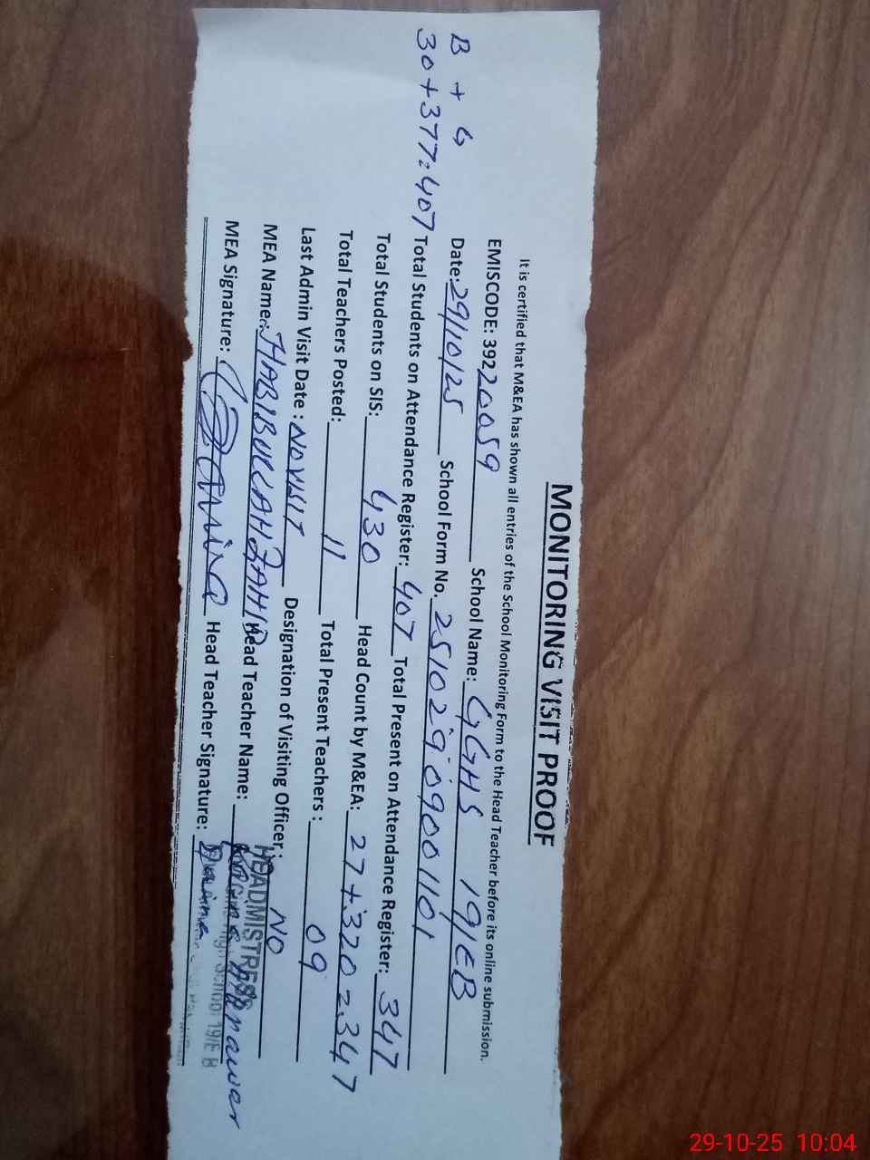 | Attendance Register | Head Teacher | MEA with School | Visit Proof |