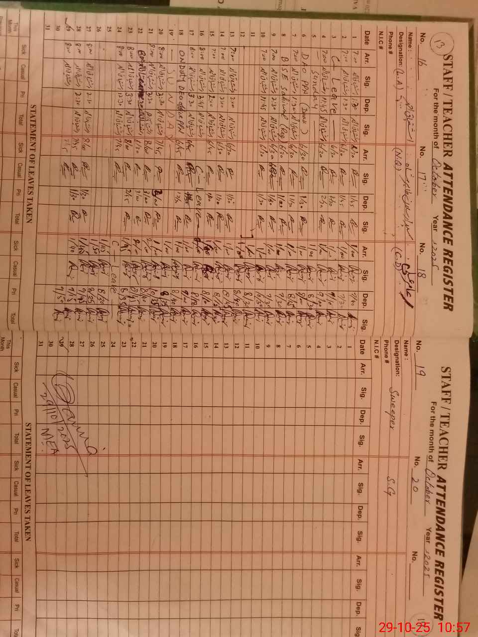 | CNIC | Full Name | Designation | R/C | Absence During Last Calender Month |