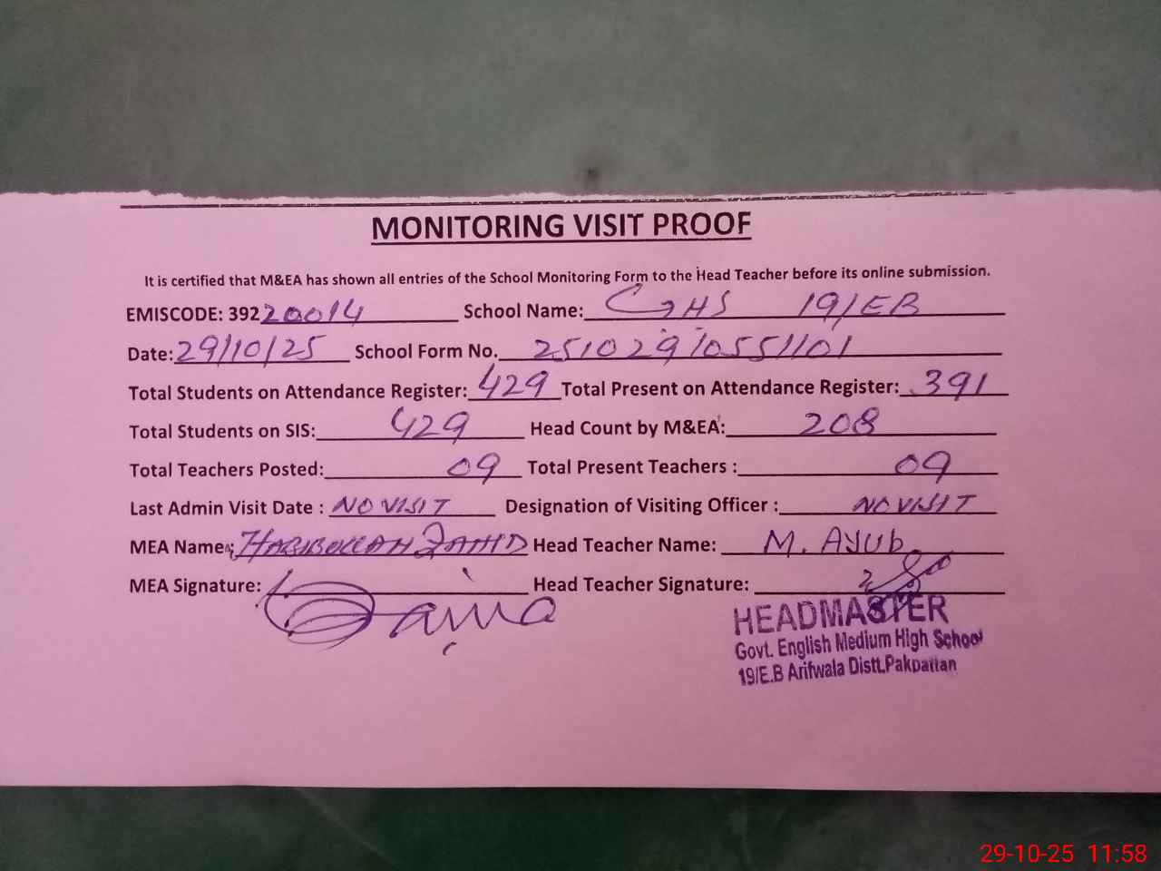 | Attendance Register | Head Teacher | MEA with School | Visit Proof |