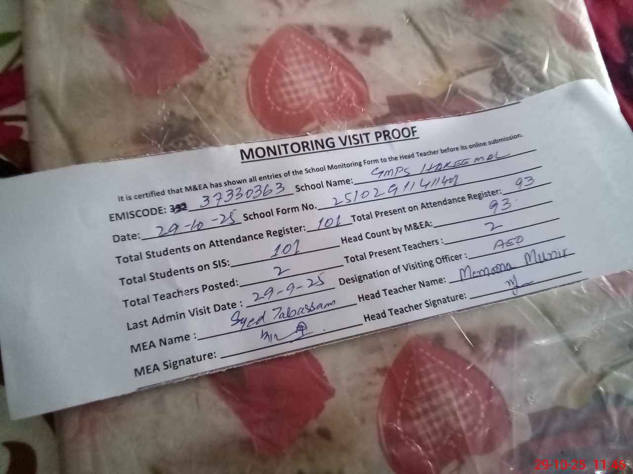 | Attendance Register | Head Teacher | MEA with School | Visit Proof |